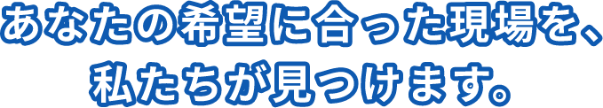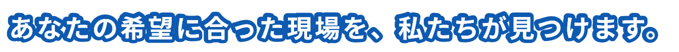 | 福利厚生 | 現場ごとに待遇や条件は異なり ますが、安心して働ける環境づ くりを心がけています。 ご希望に合わせて最適な現場を ご紹介いたします。 |